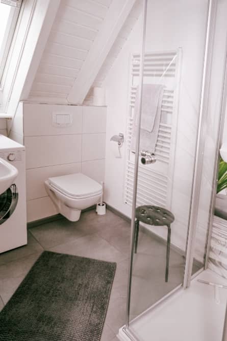 Im Wohnbereich befindet sich ein Tageslicht-Bad mit Dusche, WC und Waschbecken. Außerdem befindet sich im Bad ein Waschtrockner.